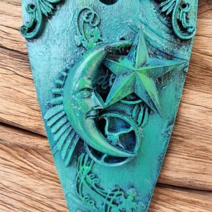 - One of a kind, wooden pallet decoration. Vintage style wall decoration hand made using air dry clay, resin, metal embellishments, stencils, texture paste, acrylic and metallic paint. Size 30cm X 24cm Painted in purple and blue tone, finished with a coat of varnish for protection.
