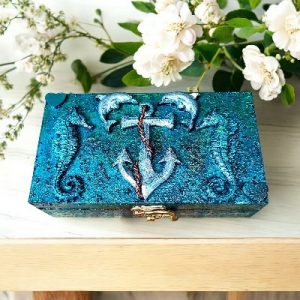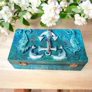 - Sea life Hand-decorated wooden keepsake box with sea life designs: seahorses, anchors, dolphins.