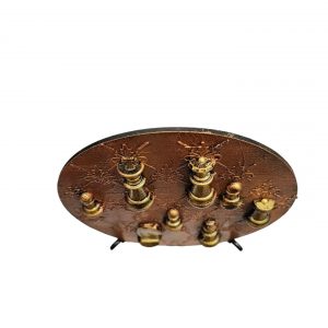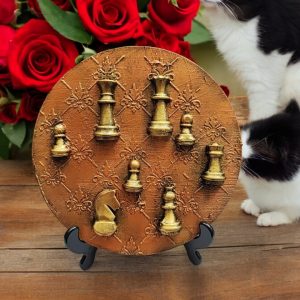 Adorn your space with the Chees Majesty Decorative Wood Slice from Gabicraft, featuring a symmetrical array of chees pieces on a golden-brown backdrop. A regal addition to any decor. 15cm x 3 mm