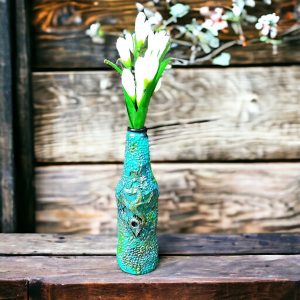 Copper Vintage Style Candle Holder Cone-shaped glass transitions into a beautiful vintage-style candle holder. Hand decorated with clay embellishments, painted with acrylic and metallic paint. Finished with a coat of varnish for protection. Comes with a vanilla-scented candle. Size 22cm tall, the base 10cm and the top circle 7.5cm.