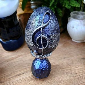 • Handmade Musical Note Decorative Egg, crafted from polystyrene, ceramic, and lace, painted in dark purple with silver accents.