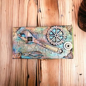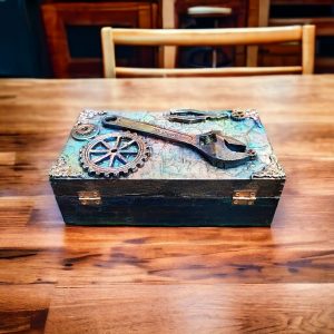 • Wooden Box, Rusty Steampunk Box for Keepsakes, Handcrafted Steampunk Jewellery Box, Antique Industrial Charm, Mechanical Gears Box This steampunk-inspired box combines artistry and functionality, making it a unique and captivating piece. The rectangular box features intricate designs on its lid, including mechanical gears and other parts, giving it an antique and industrial look. The lid is hinged for easy access,…