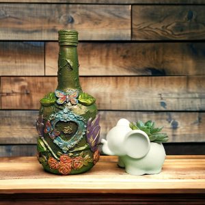 Hand Decorated Glass Bottle, Flowers And Butterflies, Gift Idea, Glass Art Hand decorated with beautiful dry clay embellishments made by myself. Painted with acrylic and metallic paint.Finished with a coat of varnish for protection. The bottle can be refilled easily with any liquor but you can also use it like a vase. It is recommended not to get wet because…