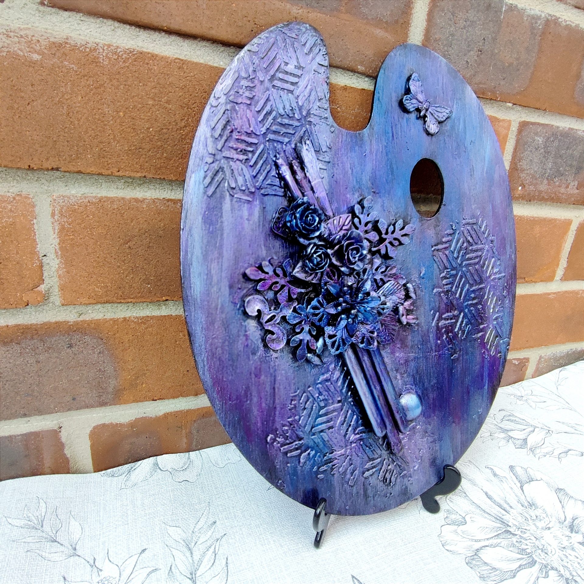 Vintage style wall decoration hand made using air dry clay, resin, metal embellishments, stencils, texture paste, acrylic and metallic paint.