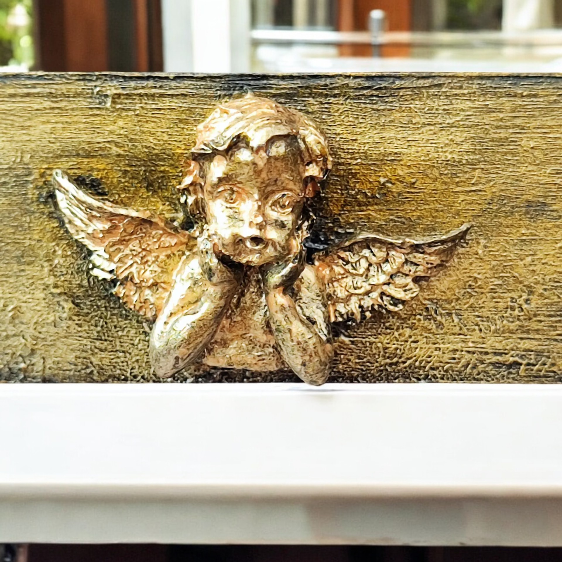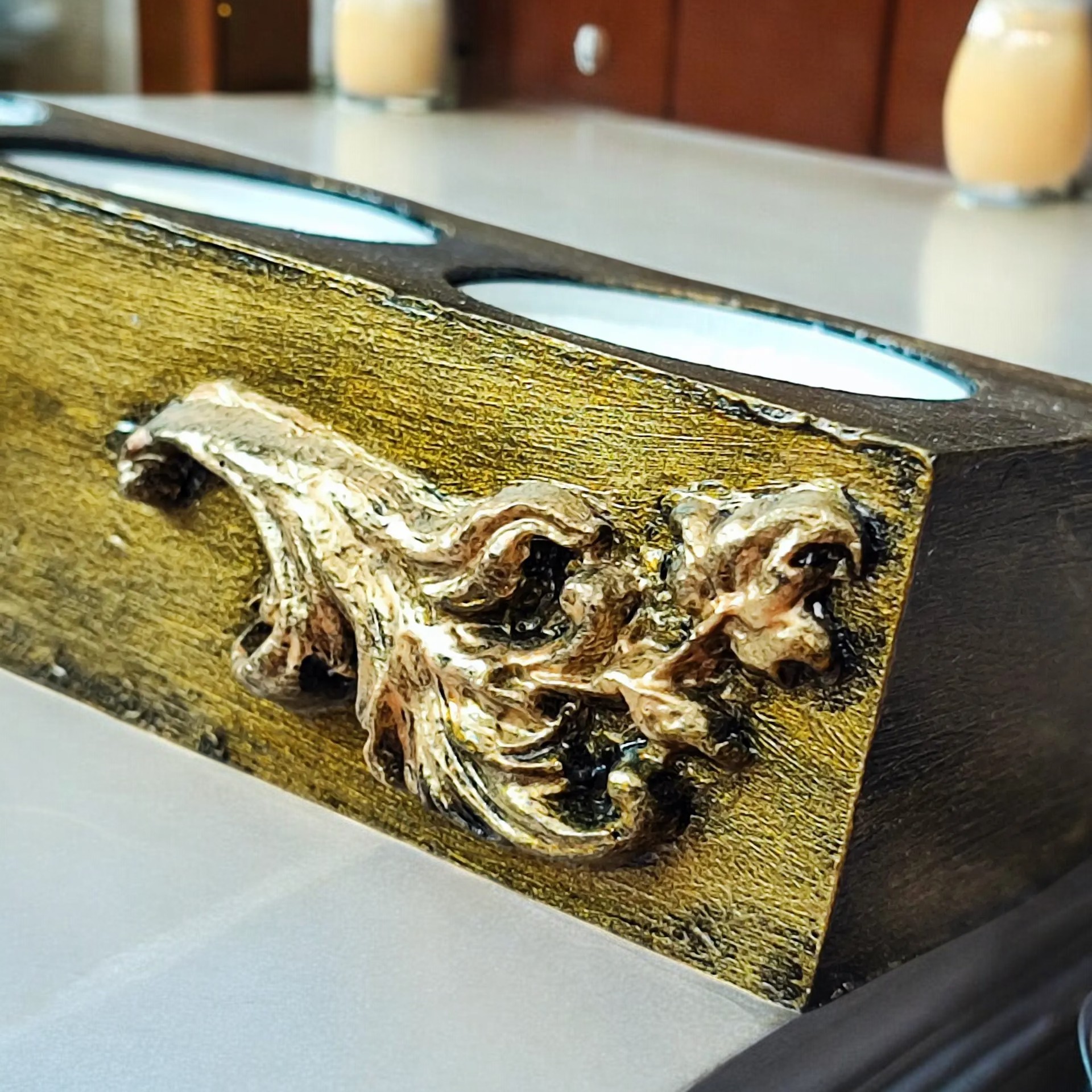 The wood is decorated with resin and air dry clay embellishments, painted in black colour with gold tone. Finished with a coat of varnish for protection.