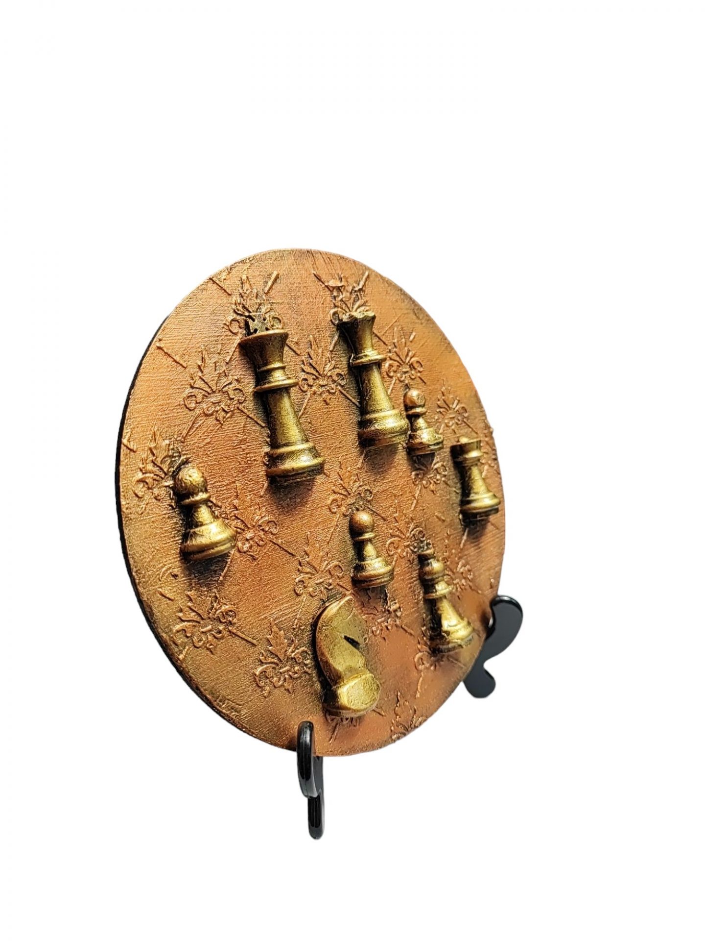 Adorn your space with the Chees Majesty Decorative Wood Slice from Gabicraft, featuring a symmetrical array of chees pieces on a golden-brown backdrop. A regal addition to any decor.