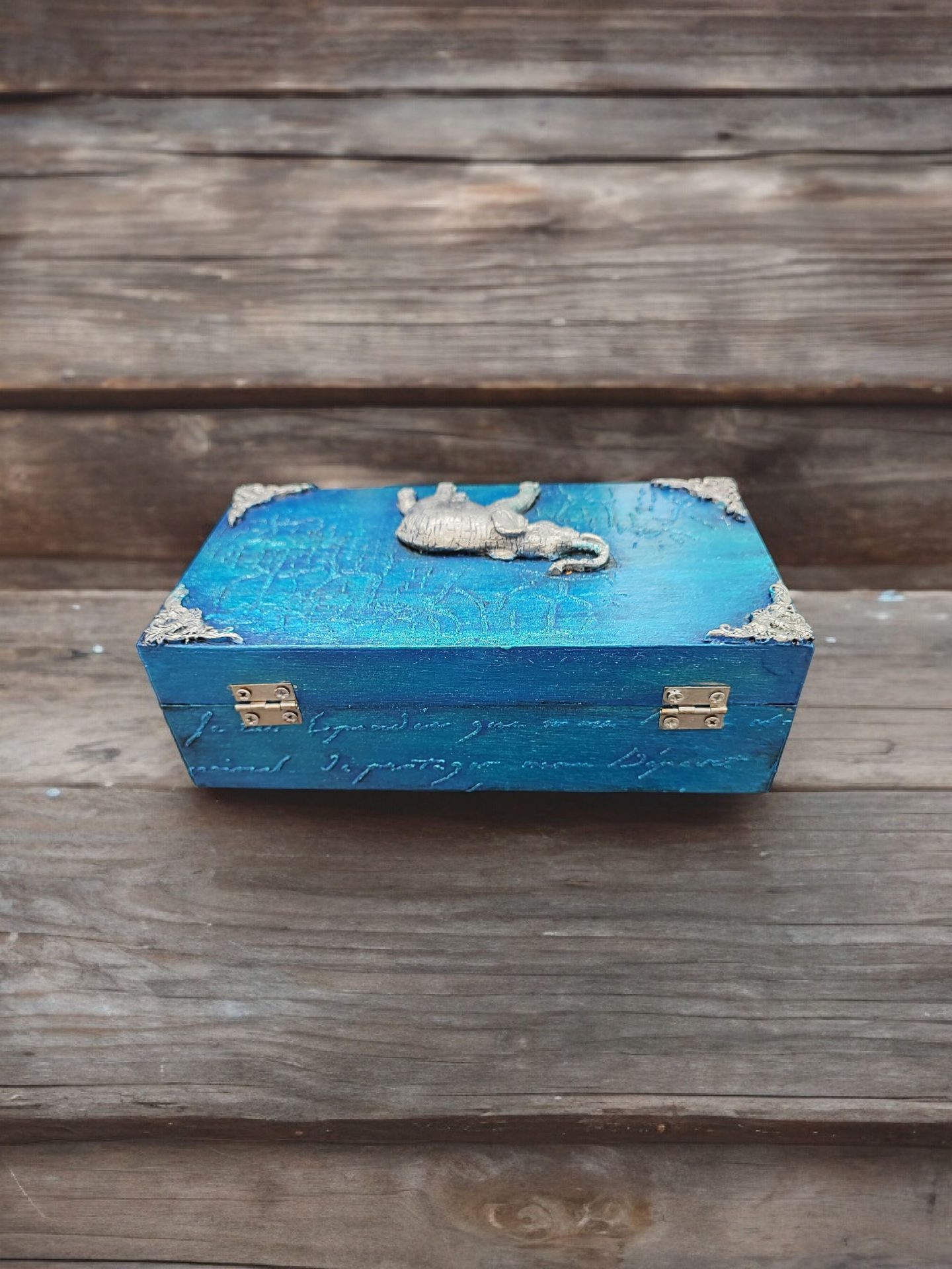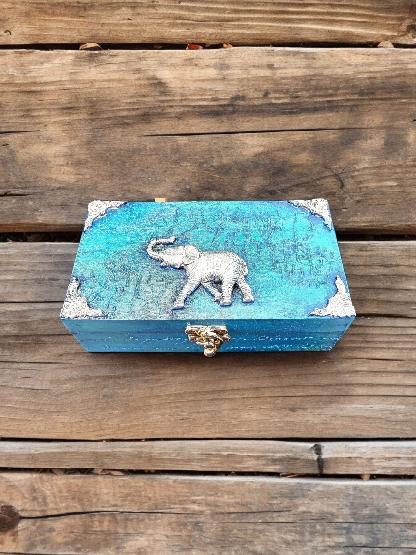 The rectangular box features a silver elephant embellishment on its lid creating an enchanting contrast against the rustic backdrop.