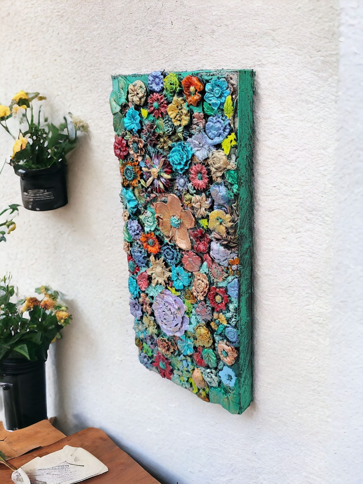 This handcrafted clay floral wall decoration will add a touch of unique charm to your space. Made with intricate clay embellishments, this one-of-a-kind piece features a stunning mix of colourful flowers, textures, and metallic accents. It is perfect for adding a boho, vintage, or nature-inspired vibe to any room.