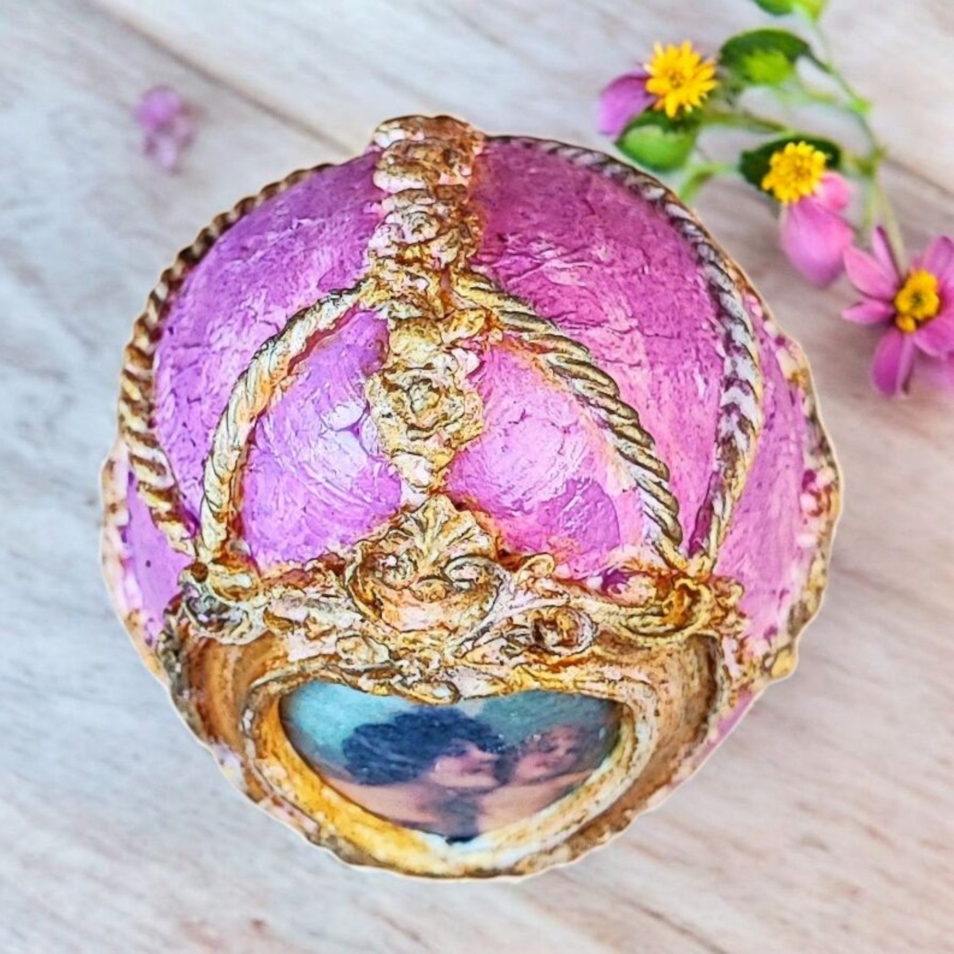 This exquisite handcrafted decorative egg is a charming piece of art that combines elegance and romance. Painted in a lovely pink hue, the egg is adorned with intricate gold details and a delicate heart-shaped frame. At its centre, it features a vintage-style romantic image inspired by Victorian charm. Perfect for collectors, gift-givers, or anyone looking to add a touch of elegance to their home décor. Handmade with care, this unique piece is both a timeless keepsake and a striking decorative item.