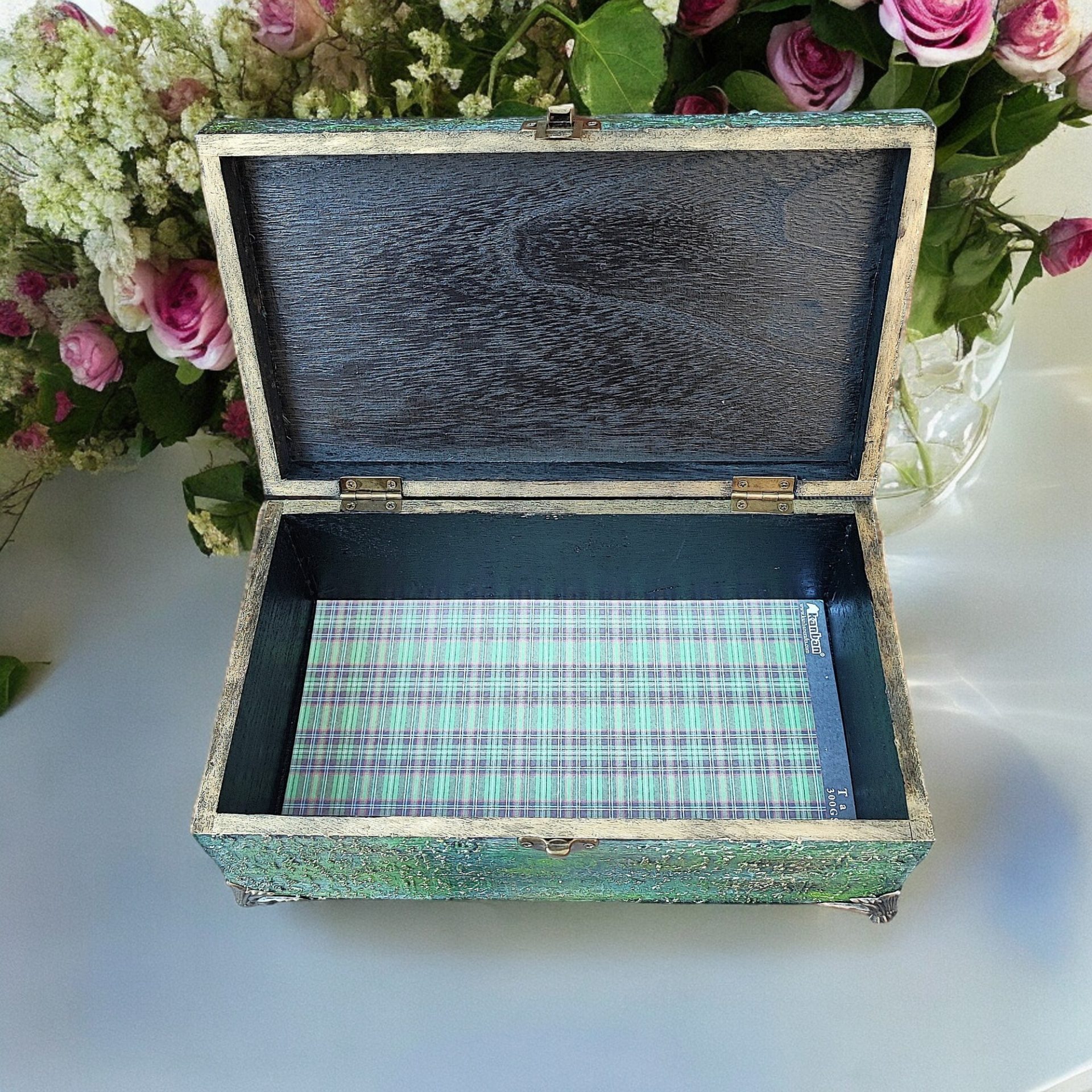Keep your favourite jewellery safe and secure with this vintage hand-crafted wooden box. With a beautiful decoupage paper lining and a unique dragon theme, this box is perfect for holding all your precious pieces including necklaces, bracelets, anklets, rings, cufflinks, earrings, and body jewellery. The green colour adds a touch of elegance to the design.