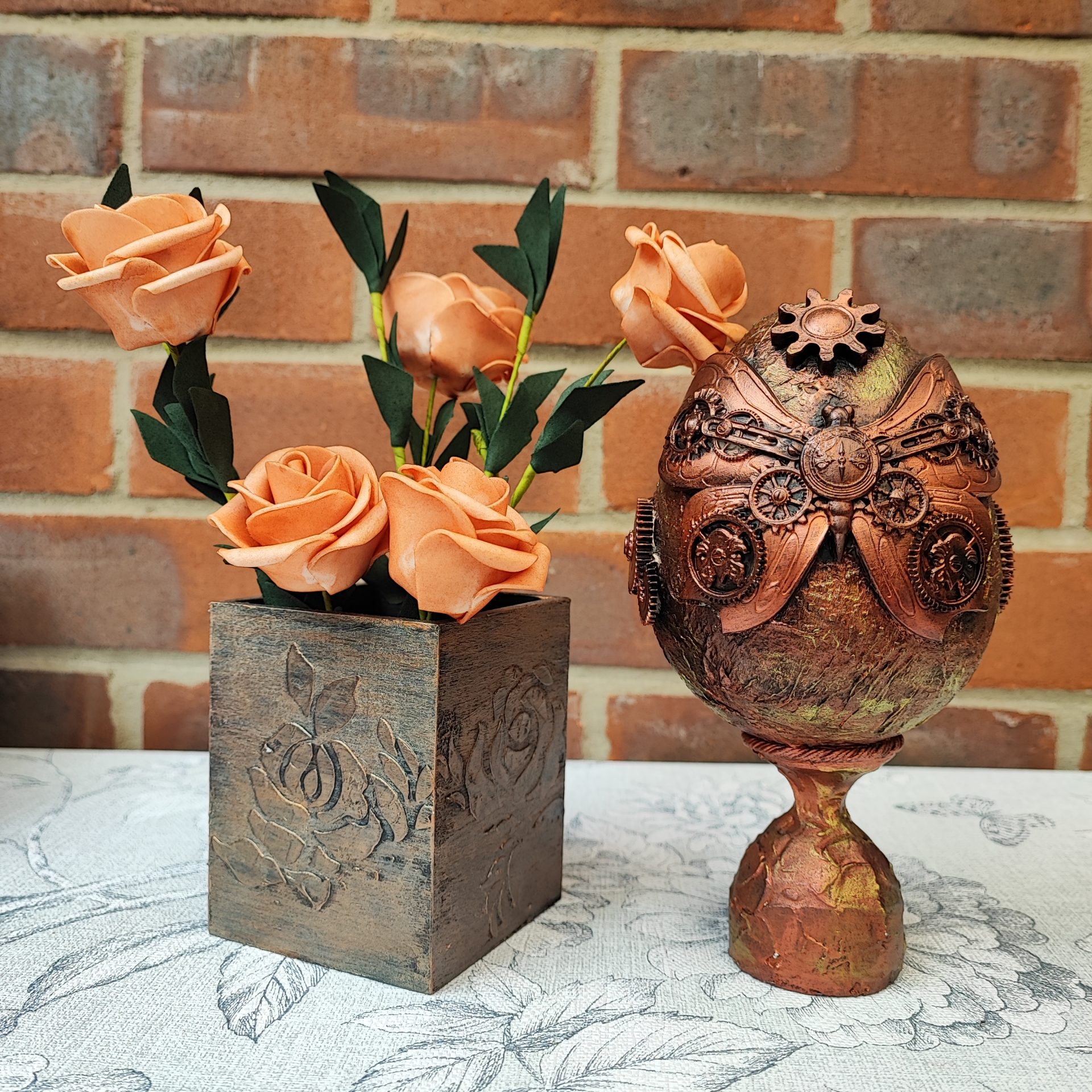 Decorated with air-dry clay embellishments, hand painted with acrylic and metallic paint, and finish with a coat of clear varnish for protection.