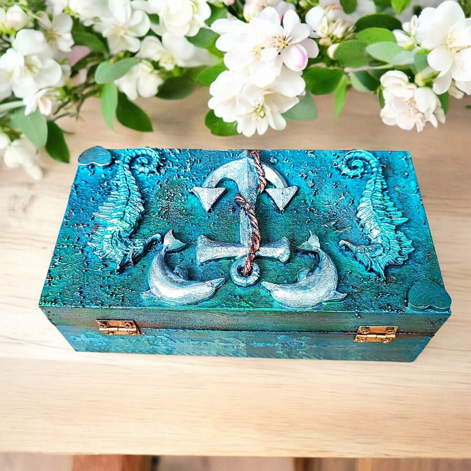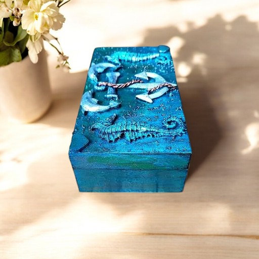 Experience the beauty of the sea with this hand-decorated wooden keepsake box. Its rich blue textured surface is adorned with meticulously crafted resin and clay embellishments, including two seahorses, a central anchor interwoven with a rope, and playful dolphins. The gold-coloured latch adds a touch of elegance, ensuring your treasures are safely stored. Ideal for holding jewellery, trinkets, or cherished mementoes, this box combines functional storage with artistic design, making it a charming addition to any home decor. Perfect as a gift for ocean lovers and those who appreciate fine craftsmanship.