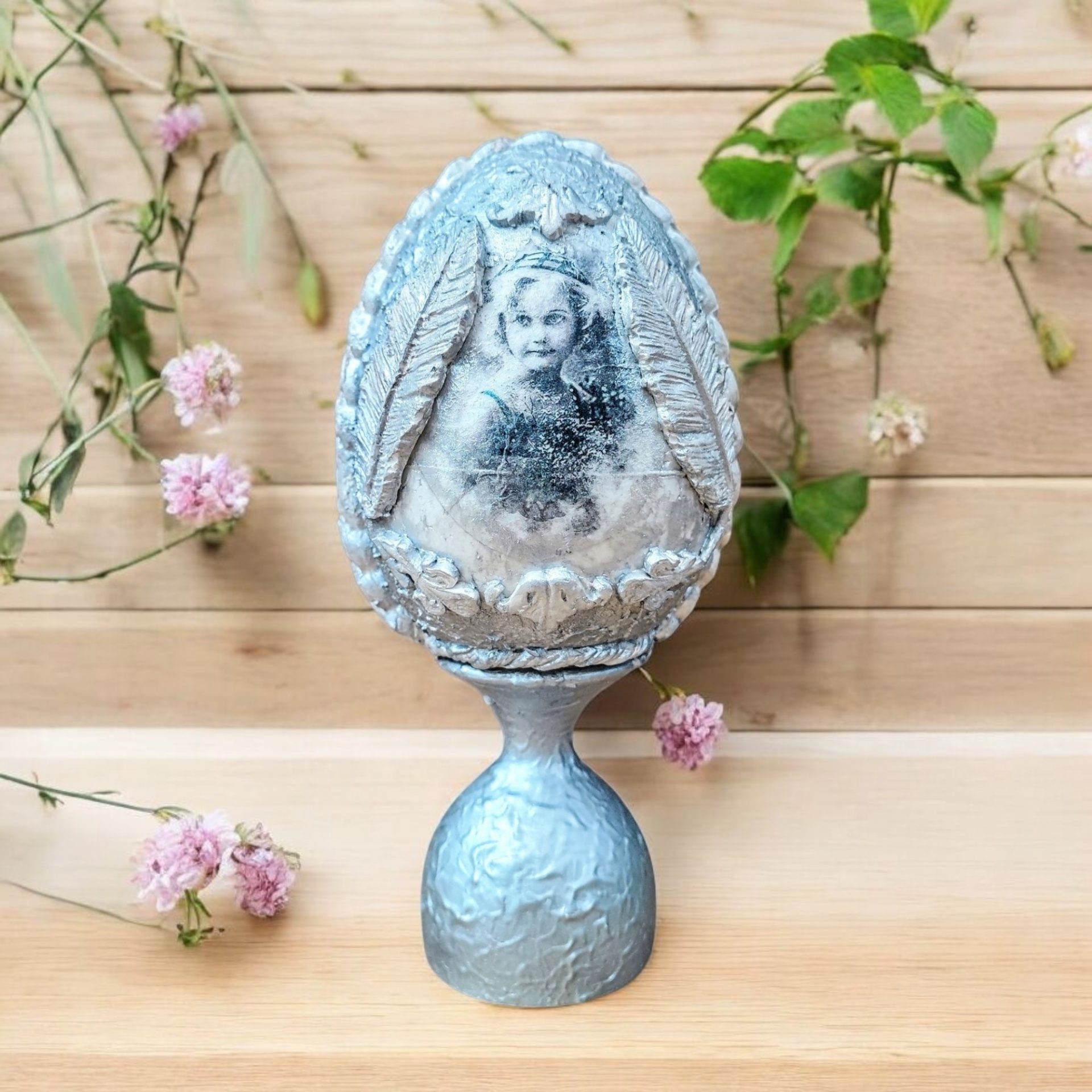 Silver Memory Keepsake Egg with Vintage Photo Design, Handcrafted with Love