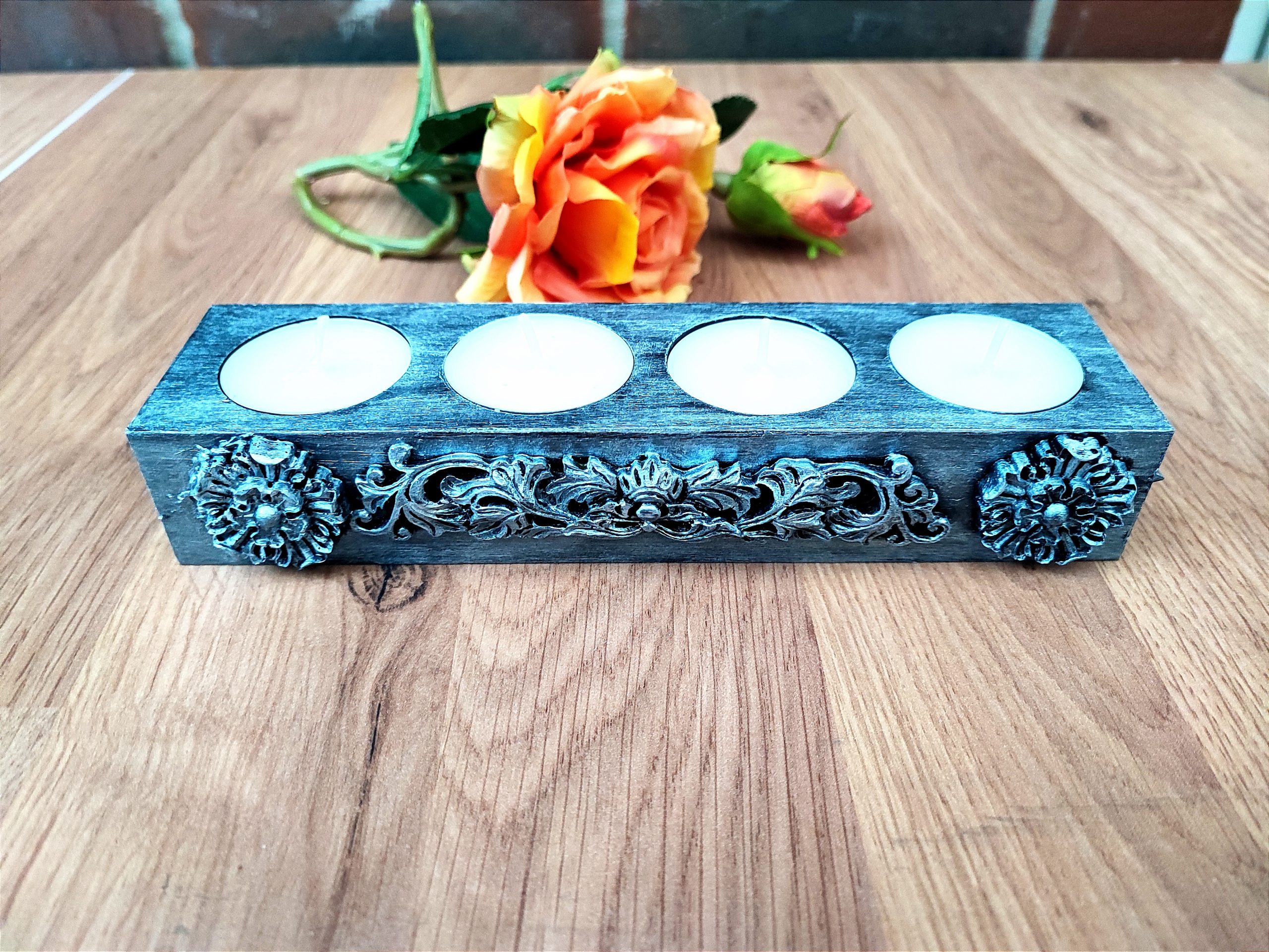 The hardwood tea light candle holder is hand-painted metallic silver and decorated with resin and air-dry clay.