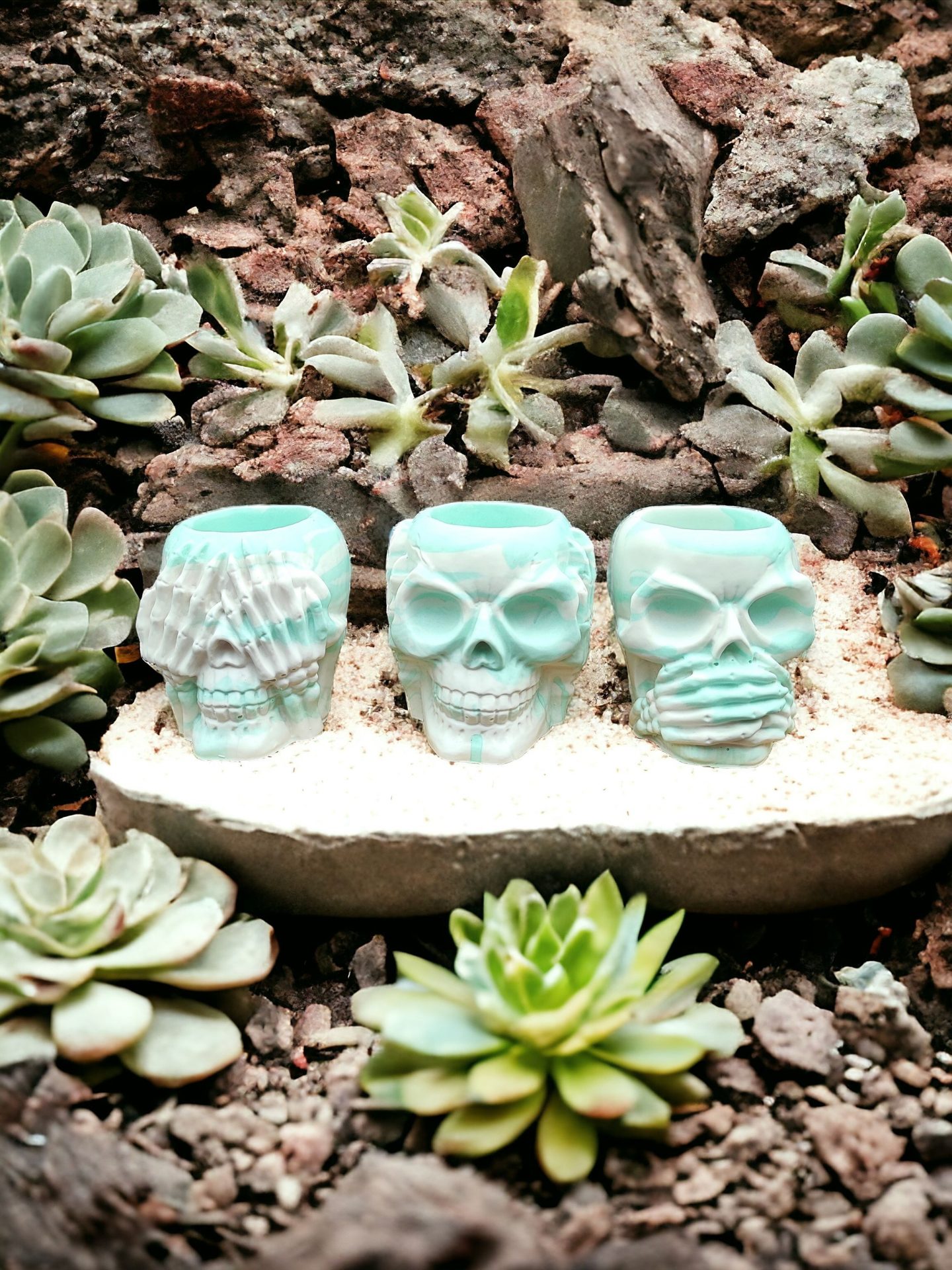 See No Evil, Hear No Evil, Speak No Evil Skull Succulent Flower Pot. Halloween Decoration. Set of 3 unique decorations.