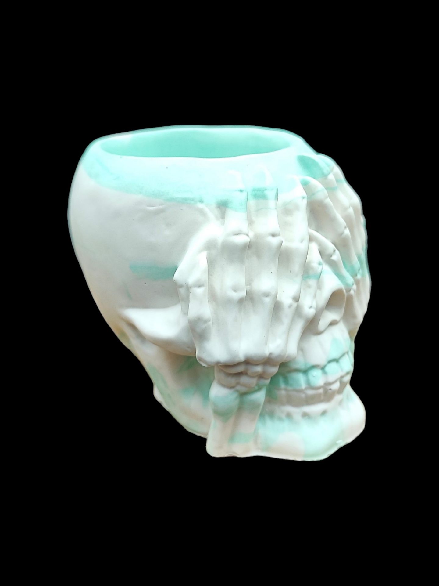 This flower pot is perfect for those who love succulents. The pot is designed in the shape of a skull, with white and marble green colours that give it a distinctive look. It is a hand-made product, made in the United Kingdom, and is compatible with various types of succulents.