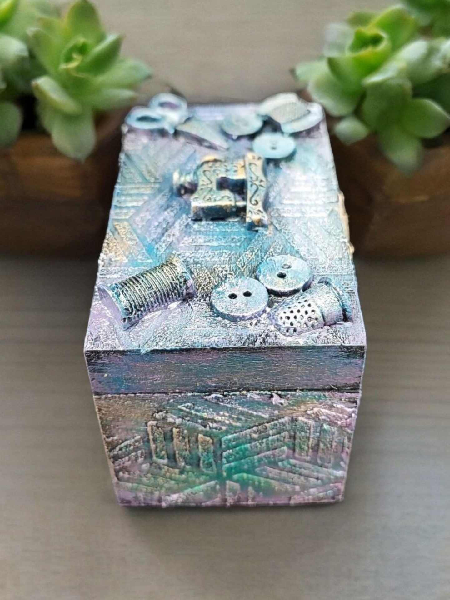 You will find an eclectic arrangement of buttons, a tiny pair of scissors, a thimble and a miniature sewing machine on the lid.