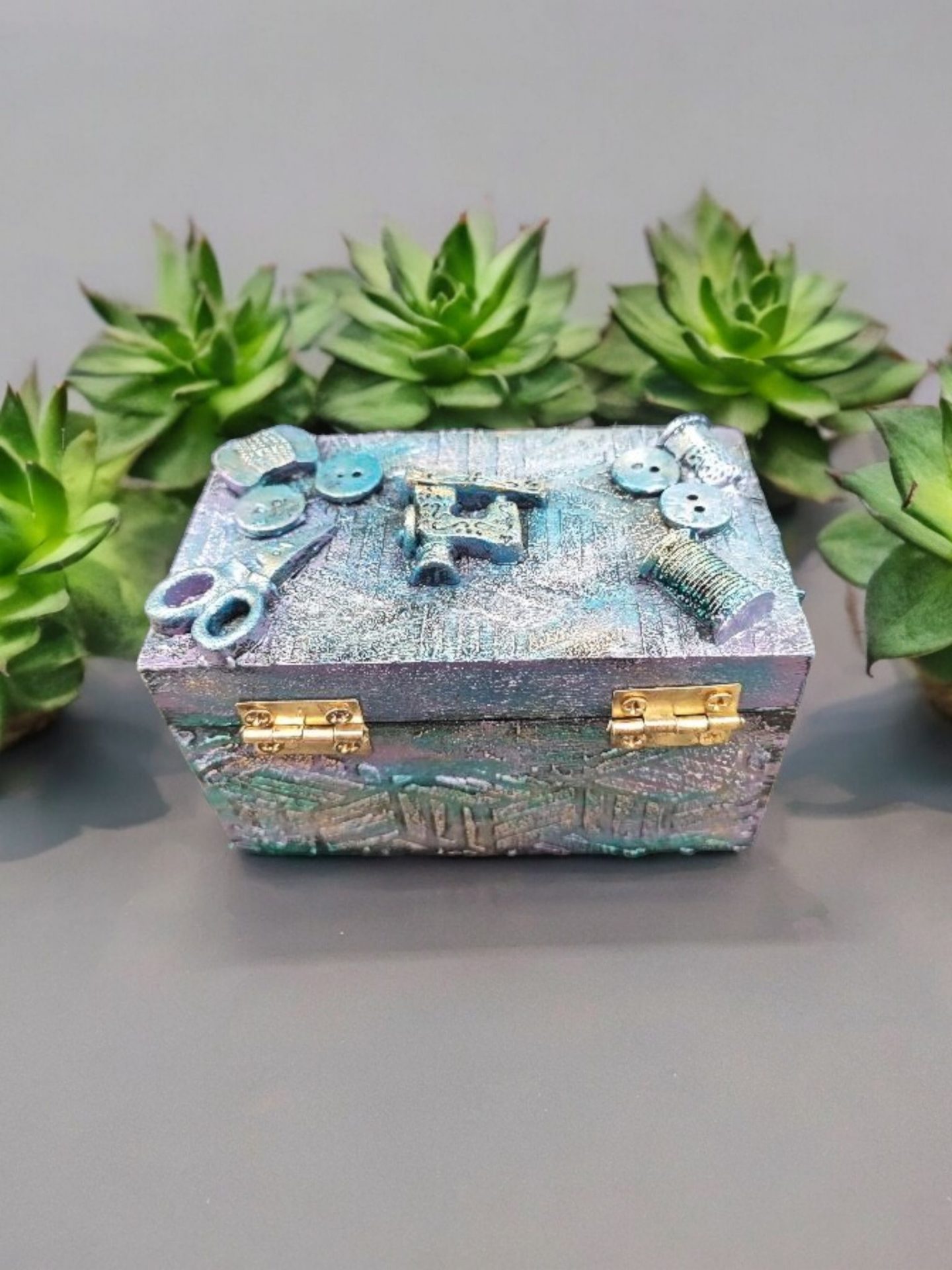 This jewellery box is a unique and handcrafted piece that is perfect for storing small items such as jewellery, money or even decorative items.