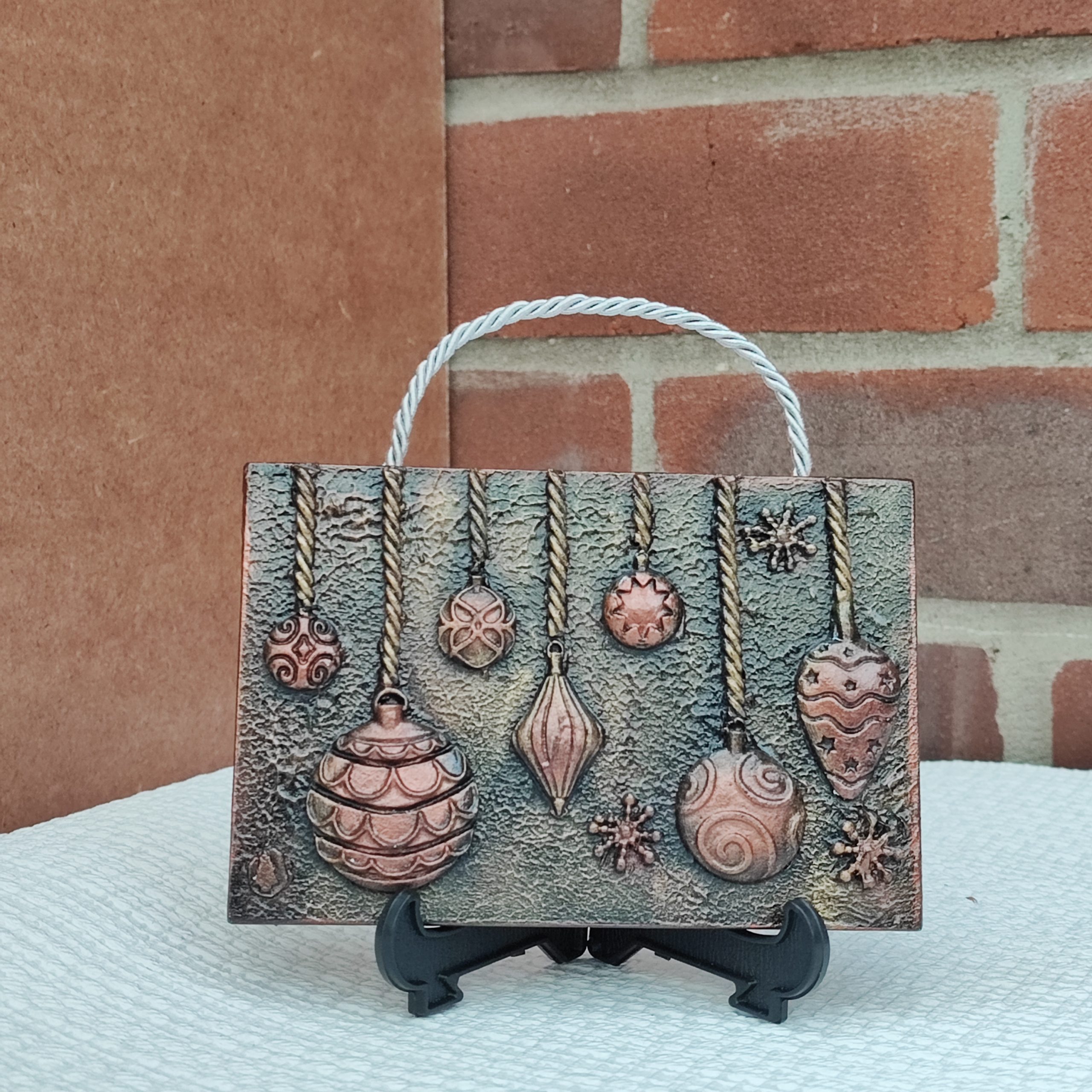 Small piece of wood decorated with air dry clay Christmas embellishments.