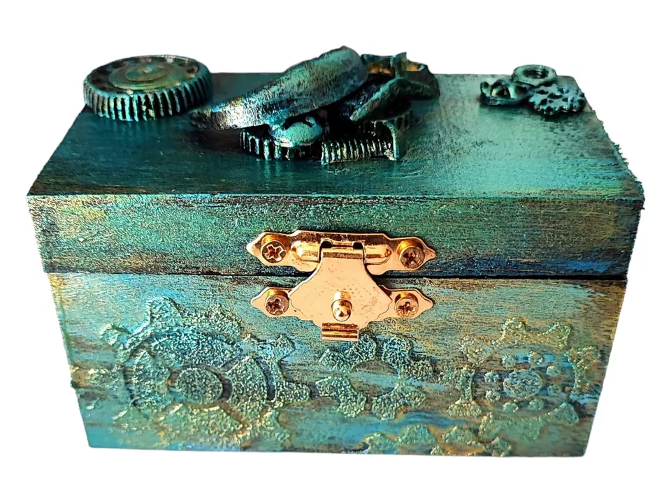 The box features a lid made from wood with beautiful cogs and gear patterns in green and blue.