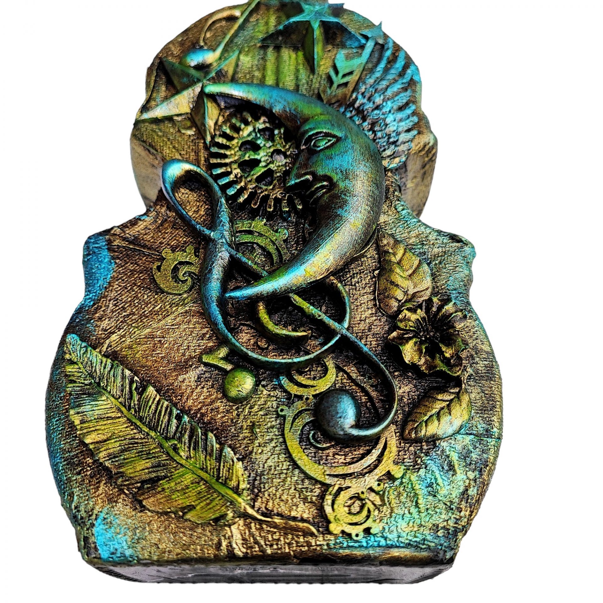 Violin-shaped glass bottle decorated with air-dried clay and resin embellishments. You can see a beautiful moon surrounded by stars, musical notes and steampunk elements.