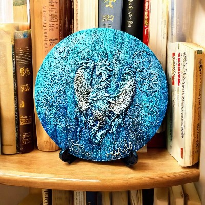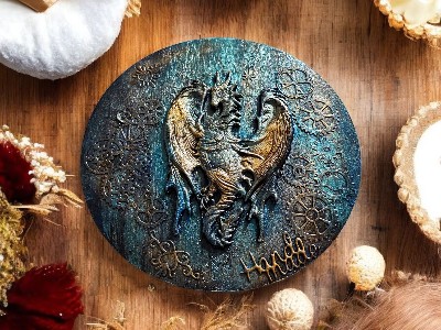 Add a touch of enchanting steampunk style to your home with this stunning 20cm steampunk dragon wall plaque. Handcrafted with intricate detailing, this circular decor piece features a fierce dragon in antique silver, surrounded by detailed steampunk gears on a vibrant turquoise-blue background. Each piece is handmade, meaning no two are identical, making it a unique addition to any space. Perfect for fantasy lovers, steampunk enthusiasts, or anyone looking to bring a bold, mystical element to their decor. Display it proudly on a wall or shelf – it’s sure to be a conversation starter!