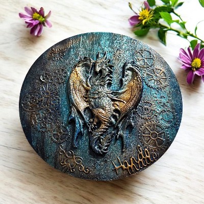 Materials: High-quality wood, metallic paint, steampunk embellishments Finish: Hand-painted with turquoise-blue background and antique gold dragon