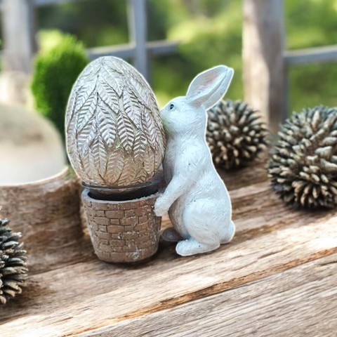Easter decoration featuring a white bunny holding a beautifully detailed egg with a nostalgic design.