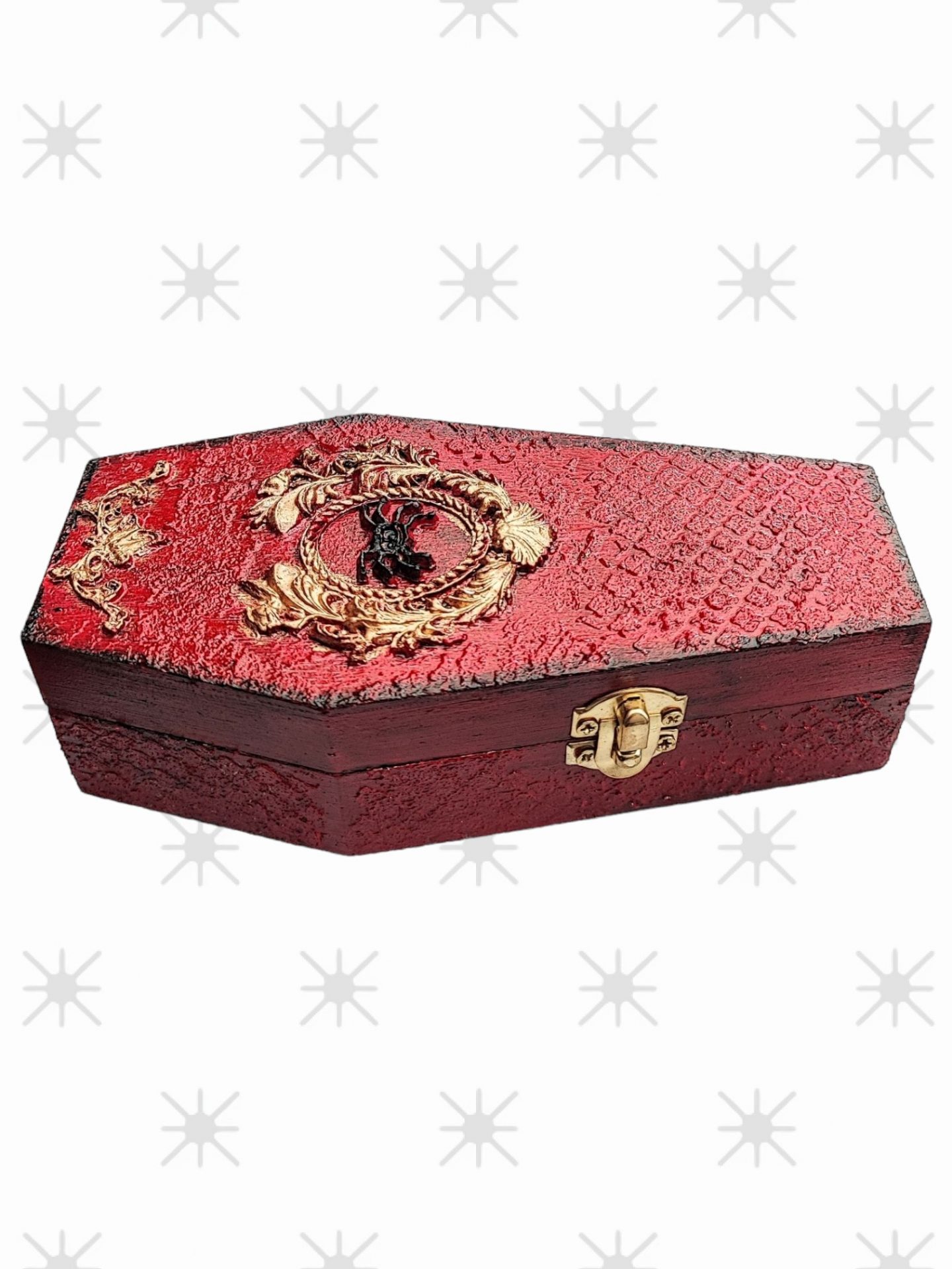 This unique trinket box is designed to resemble a miniature coffin, exuding an ornate gothic aesthetic. The textured crimson finish, adorned with golden embellishments, evokes an antique elegance. At its centre is a black motif- a spider rests within a golden frame, capturing attention. The coffin shape adds intrigue, making it a captivating conversation piece or a distinctive storage option for jewellery and keepsakes. Whether displayed on a shelf or used practically, this box appeals to those with a taste for eclectic and vintage-inspired decorations.