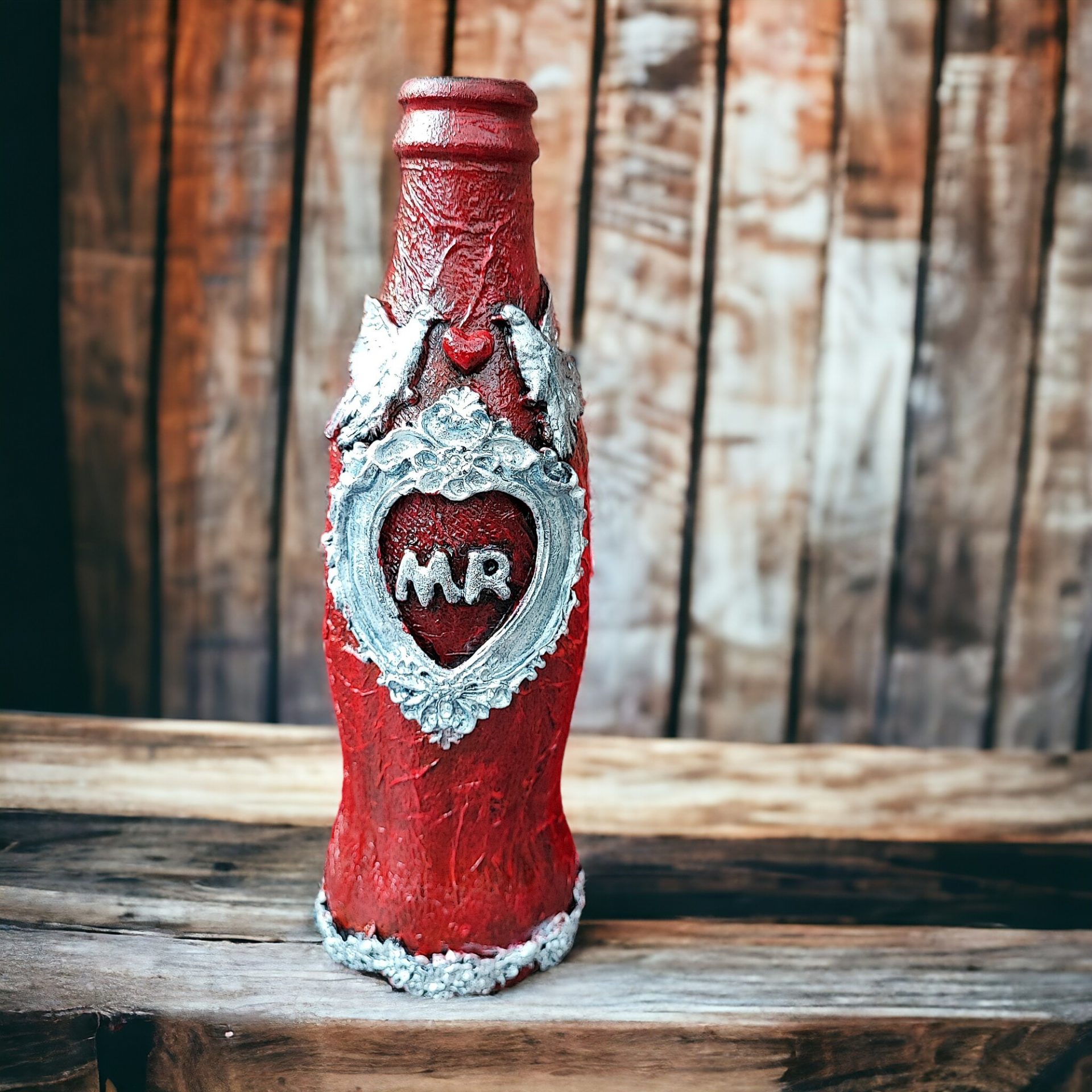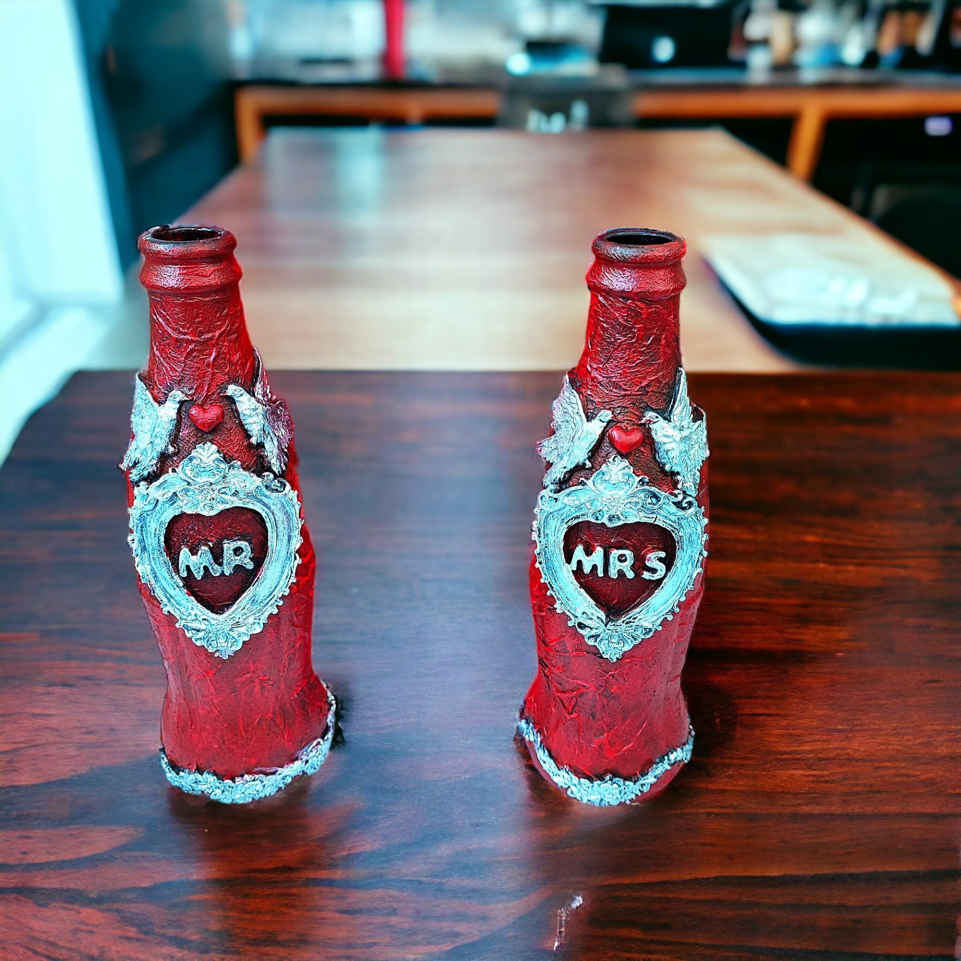 Transform your space with this charming Steampunk-style hand-decorated glass bottle adorned with air-dry clay and resin embellishments. This unique pair of Mr. & Mrs. exudes vintage charm and makes for a captivating decorative piece or a stylish gift to make someone’s day! Delivered in a meticulously crafted handmade box with a lid, the interior is lined with velvet, ensuring your item is presented with both style and elegance.